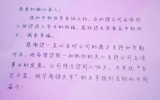 一份定制的中秋果礼,送给最尊贵的你~中秋节将至 您想要怎么样的中秋礼物呢? 有人给出了答案。 最让男人流鼻血的礼物 飞机上,嫦娥仙子翩翩起舞为旅客送上了美味的月饼。 最无悬念的礼物 还是按传统方式送月饼? 你信不信 人家根本不知道哪盒是你送的 最给人希望的礼物 某企业中秋节给员工发了500万,真是大方。 最后得知真相的我眼泪掉下来, 原来只是2元一张的彩票。 最激动人心的礼物 过节红包的信封那么厚,吓我一跳,太激动了... 打开一看,只有16元。问为什么, 答道:因为十五的月亮十六圆啊~ 最有脑洞的礼物 看到某单位中秋节发了迟到卡, 无理由迟到真惹人羡慕。 后来才知道,仅限中秋节加班使用。 看到这里 小编不禁想说 咱能送点走心的礼物吗? 有! 酷比爽味包作为 逹理事业联盟联盟的核心成员 早在几个月前就开始了辛勤准备 专门为全体家人定制了中秋礼物 原产地红心柚 柚子外形浑圆象征团圆之意, 同时,“柚”与“佑”谐音, 代表希望月亮护佑的美好意愿, 再加上中秋节前后又适逢盛产期, 更有“大吉大利"之意。 逹理专属定制月饼 从选料,到定模,型制和分量 酷比都极尽考究 酷比十多年中秋给酷比家人送定制月饼 这种传统一直被延续和传承。 一份情真意切的中秋家书 手写隽秀的字迹, 一字一句感谢您多年的携手和陪伴, 有了您和我们更加不懈努力 酷比才不断砥砺前行。 加盟同仁感谢一片,部分节选 您的认可,是我们最大的肯定和荣耀 您也许并不缺一盒月饼 而我们送出的是一片真心 诚挚的祝愿送给最珍贵的你! 亲爱的酷比人, 祝你们中秋节快乐! 酷比爽味包是广东一家极具面点特色的餐饮文化连锁品牌,酷比产品相继被评为“广东名点”“广东名小吃”“中国名点”“中国名小吃”,现有品牌门店遍布广东广州、佛山、肇庆、韶关、东莞、中山、清远、河源、茂名等地。酷比一直秉持做良心食品的宗旨,坚持精工、好料、好味道的原则,坚持把最新鲜,最美味,最健康的产品呈献给每一位顾客,希望社会因我们的坚持而变得更加美好,我们要做有良心有责任感的阳光企业!为了您的健康是我们一直坚持的目标。 -END-